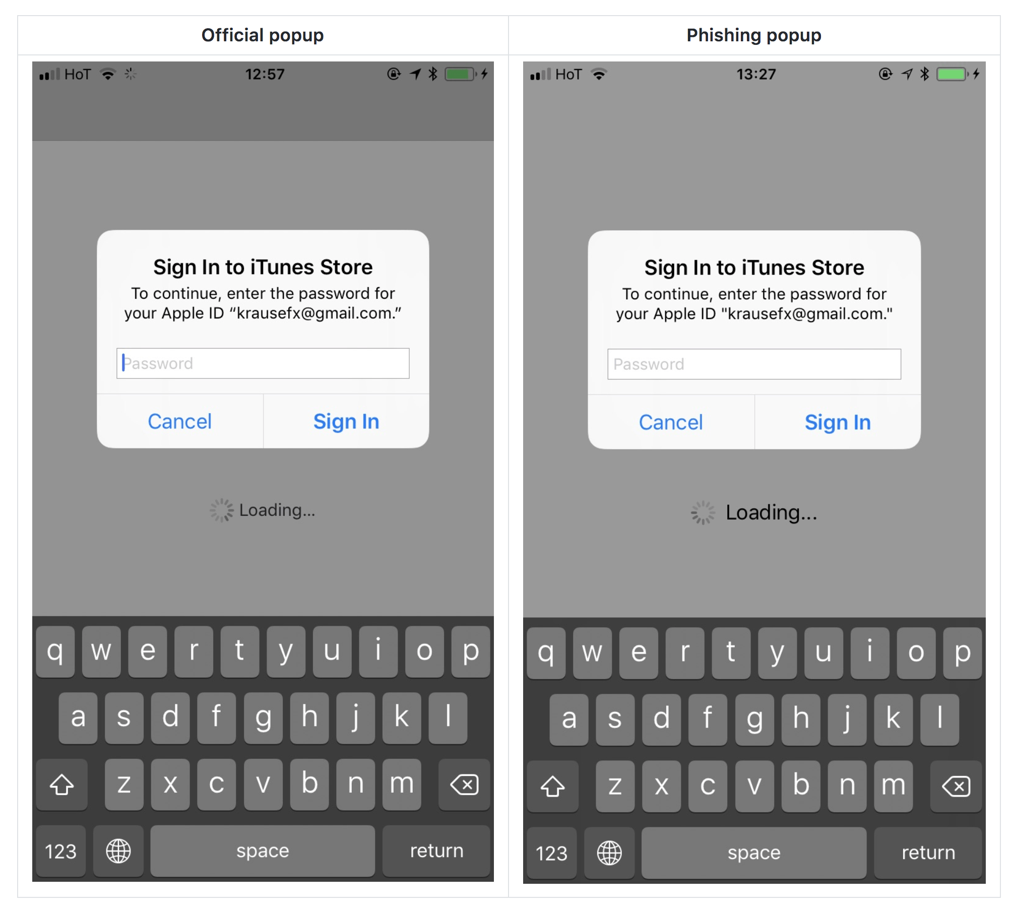 One of these is Apple asking you for your password and the other one is a phishing popup that steals your password.